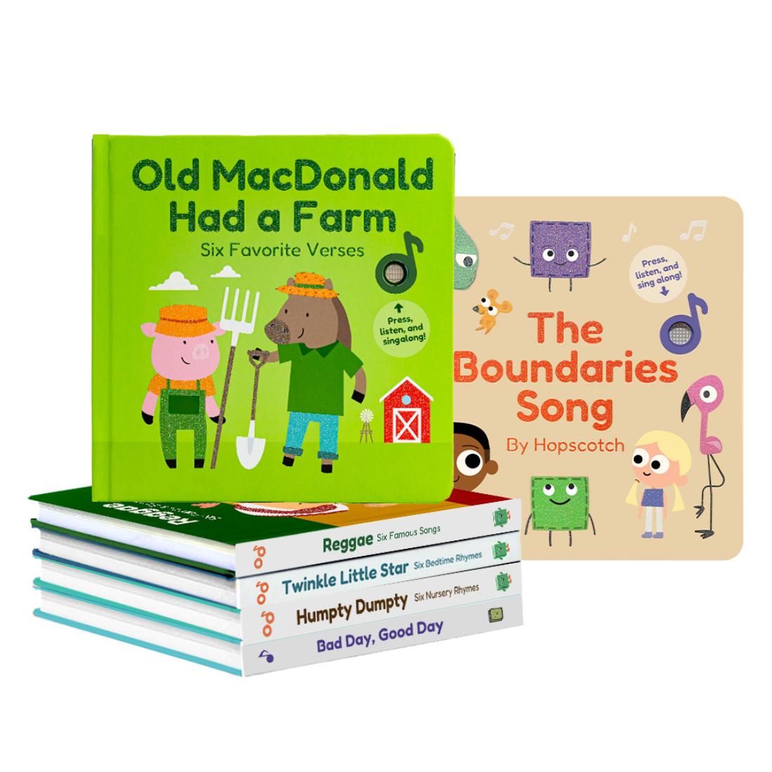 - Includes 6 musical sound books: Old MacDonald, Twinkle Twinkle Little Star, Reggae First Playlist, The Boundaries Song, Humpty Dumpty, and Bad Day, Good Day